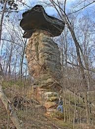 Jug Rock is a natural geological formation located outside of Shoals, Indiana, in the valley of the East Fork of the White River. It is composed of sandstone, and is the largest free-standing table rock formation (also called a "tea table") in the United States east of the Mississippi River. It is part of the Mansfield formation, laid down in the Pennsylvanian geological epoch, roughly 325 to 286 million years ago. Erosion along fracture lines separated it from a nearby cliff. A companion feature, House Rock, stands opposite Jug Rock. In the Second Report of the Geological Survey of Indiana, published in 1871, State Geologist E. T. Cox wrote: